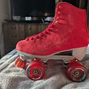 I bought these lightly used, tried them on, but never used them. The original owner barely used them either--the suede hasn't been broke in yet. There are some spots on the red suede that have faded, and some scuffs, as shown in the photos. Sure Grip Boardwalks, good wheels, size US 6 EU 38.