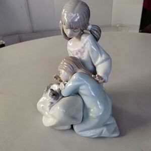Lladro Sisters with Cat Porcelain Sculpture Cream & Brown Collectibles Bedtime