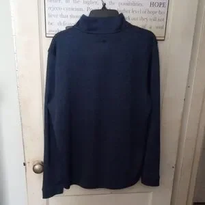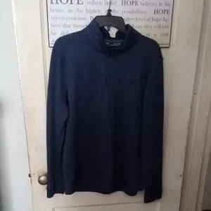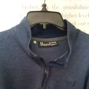 Comfortable and sleek 1/4 zip design. Ideal for layering. Navy blue UA pullover that fits smaller. Perfect for skateboarding, snowboarding, looking professional on the job, or for just a casual day with the wife and kids. It was purchased out of town and it didn't fit when I finally got home and tried it on. Jacket has never been worn, other than that. It's warmer than you'd expect too, especially with layers. From a non smoking home with no pets or children and the pullover has NO FLAWS.