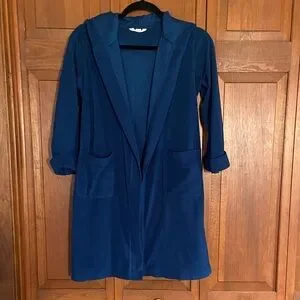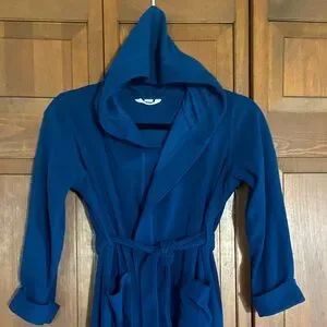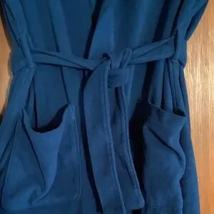 Soft navy robe with hood. Includes tie belt ( attached ) and pockets. Ideal for lounging and staying warm in colder weather months.