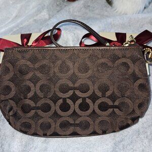 Keywords: Coach, signature jacquard, brown purse, leather trim, small shoulder bag, designer handbag, vintage Coach, bag, mini bag, evening bag, Y2K, retro, classic