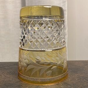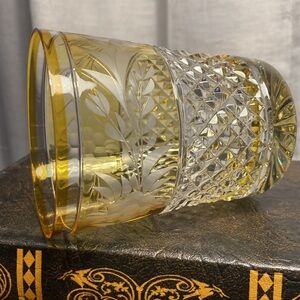 The pattern is “Marchioness” and features a flower/leaf patterned cut in the citrine colored glass.