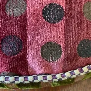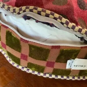This is a rare vintage Mackenzie Childs round velvet pillow with grossgrain ribbon bows. The pillow has 2 different sides. Deep velvet colors, just gorgeous decor for the holidays. There is some wear to the piping surrounding the pillow. The polka dot side has wear in that some of the velvet is worn away.
