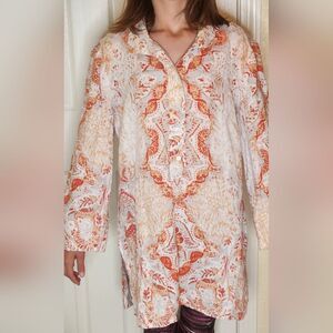 Chico's 1/M Orange White Paisley Print 100% LINEN 3/4 Slv 1/2 Button Women's Top
