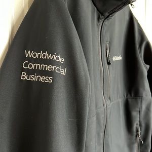 Men’s Columbia Ascender soft shell jacket with Microsoft Worldwide Commercial Business branding, black size large.