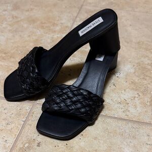 Elegant black mules with a woven design. Perfect for versatile styling.