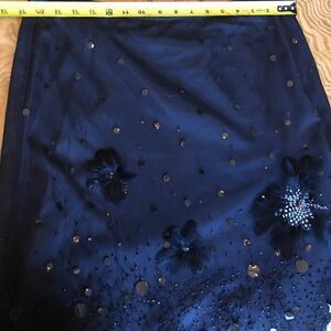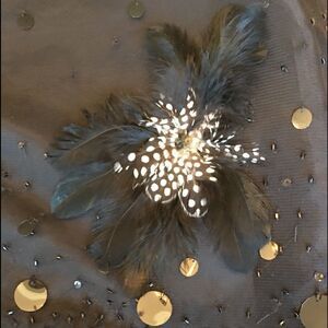 Black mixed media skirt w lining. Zipper back. Sequins and feathers with a shimmer midi hemline. This is a perfect piece for a holiday get together. Festive but subtle & easy to wear! 17” waist. 24” to hem.