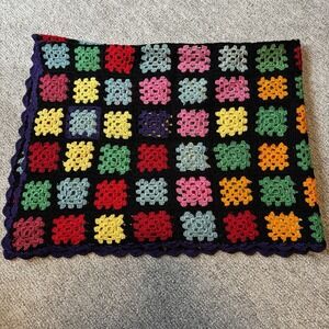 VTG GRANNY SQUARE Handmade Crochet Purple Ruffle Border 60x45 Afghan Throw 1970s