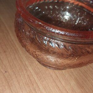 The dish is made of pink depression glass, a type of thin, often mass-produced, colored glass popular from the mid-1920s to about the end of World War II.