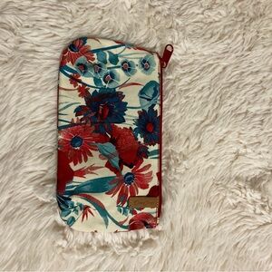 This stylish clutch by Dooney & Bourke features a vibrant floral design in red and blue. Perfect for adding a pop of color to any outfit.