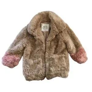 Soft faux fur jacket with a tan body. Features pink sleeve accents. Stylish and warm for kids.