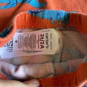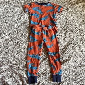 Vibrant orange pajamas featuring a playful blue dinosaur design.