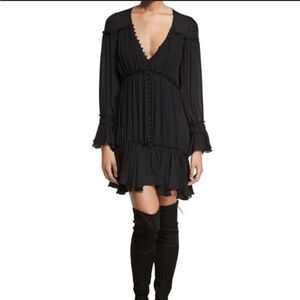Features long sleeves, elastic cuffs with ruffle flare, V neck, faux front button closure, tiered, lined, lightweight silk chiffon, in black