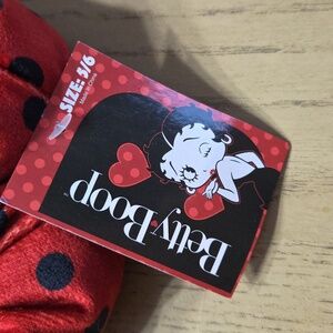 Adorable red slippers with black polka dots. Features Betty Boop design. Perfect for kids.