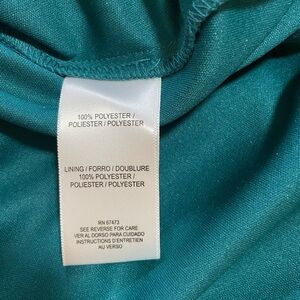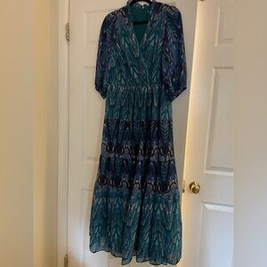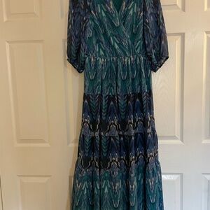 Step out in style with this elegant blue and green patterned dress. Perfect for any occasion, this dress offers a flattering fit and eye-catching design.very good condition