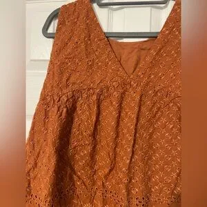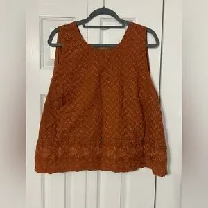 Chic terracotta blouse with delicate patterns. Sleeveless design for versatile styling.