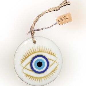 Round ornament featuring a blue evil eye design. Accented with gold details. Perfect for home decor or as a gift.