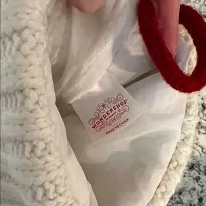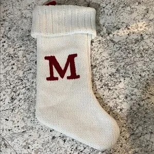 White stocking with letter M. Wondershop brand from Target. It doesn’t have any stains or holes. It has one tiny area that’s raised I’ll photograph but it’s on the back and not noticeable- just trying to point out anything I see. Comes from a dog friendly, smoke free home.