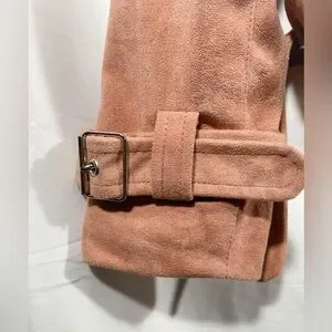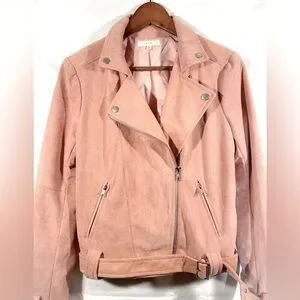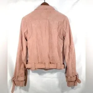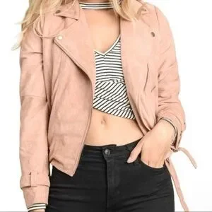 This is the perfect moto jacket to pair with any outfit. This is a beautiful blush pink color. It has buckles around the cuff and the waist, zipper pockets and is a great addition to your wardrobe! You can dress it up or dress down.