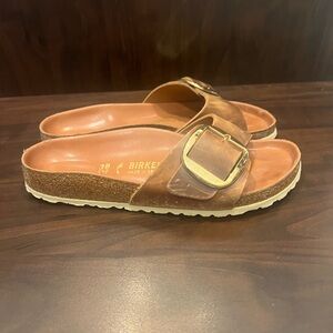 Stylish Birkenstock sandals. Rich brown leather. Gold buckle detail. Comfortable footbed.