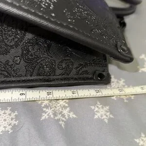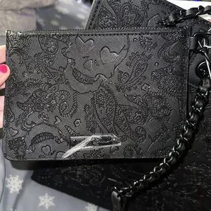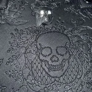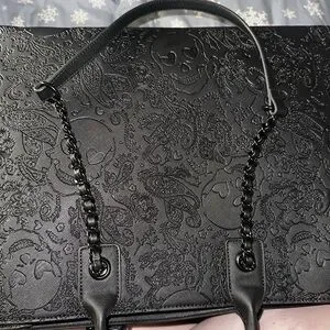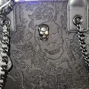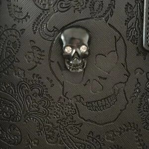 Stylish black shoulder bag. Embossed floral and skull design. Chain and leather strap detail. Perfect for any occasion.