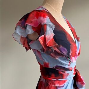 The Hutch Zola Maxi Dress is a fully functional wrap style featuring layered ruffle flutter sleeves and a flowing maxi silhouette for an effortlessly elegant look.