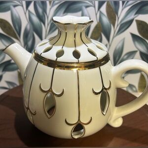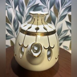It is made of ivory or off-white porcelain or ceramic with gold-tone trim and accents. This is designed to hold a tealight or votive candle inside, with cut-out openings that allow the candlelight to shine through.