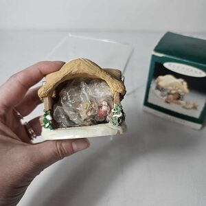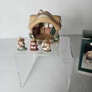 Celebrate the charm of the holidays with this Hallmark Keepsake Special Edition A Moustershire Christmas 4-piece ornament set. Released in 1995, it features the cheerful Ripengood mouse family and their snow-covered cottage from the quaint village of Moustershire. The detailed set includes the cozy cottage and three individual mice—Robin Ripengood decorating, Violet Ripengood baking, and Dunne Eaton sampling muffins. Each piece is crafted with fine detail, designed to hang individually or display together as a miniature Christmas scene.