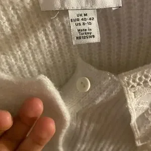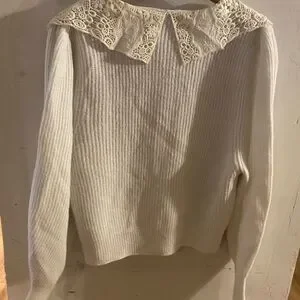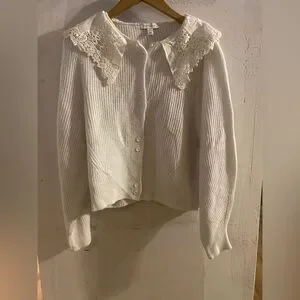 Elegant cardigan with lace collar. Button-up front. Soft ribbed texture.