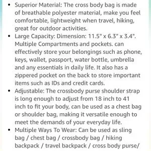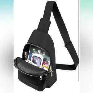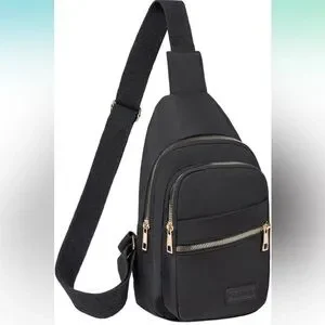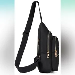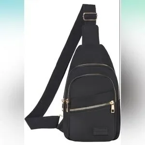 NWT black cross body sling bag with adjustable 18” to 41” cloth strap. Bag measures 11.5" x 6.3" x 3.4". Perfect size to carry all your essentials! Comes with 2 main compartments, 1 front zip pocket and 1 back zipper pocket. Lightweight polyester and easy to travel with daily.