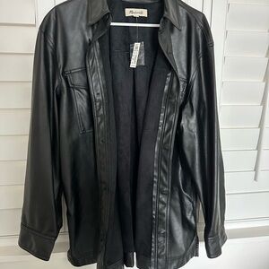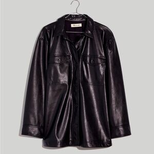 Made of supersoft faux leather, this oversized shirt-jacket has slouchy drop shoulders, patch pockets, small side slits, and buttons down the front