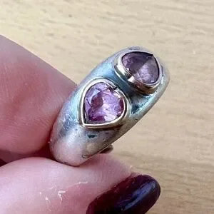 BEAUTIFUL VINTAGE RING , DONE IN 925 STERLING SILVER ( STAMPED AND ALSO TESTED) WITH DOUBLE HEART SHAPE AMETHYST STONES.