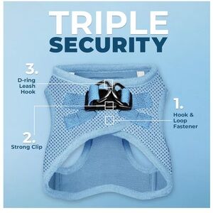 Keep your dog comfortable and secure with the Blue Mesh Dog Harness. Designed for all-weather use, this harness offers great neck and chest coverage. Easy to clip leash attachment for convenience. Two available, freshly laundered. Runs small, please see photos for size reference and or message with questions. Worn by lab puppies at 2 months, outgrew at around 15-18 lbs.