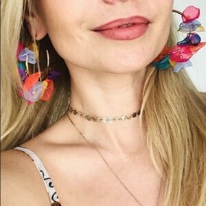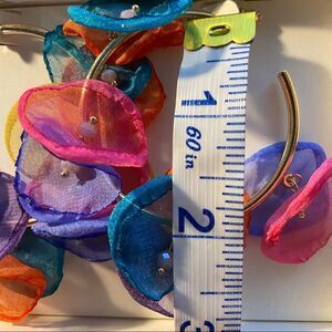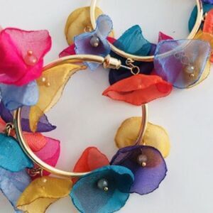 New in box, pretty earrings in with fabric flowers and beaded center. Measures 2” circumference. Beautiful spring/ summer colors in pinks, yellows, orange and blues.gold tone hoop.
