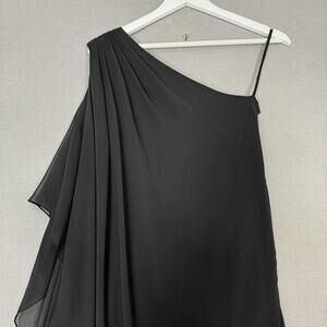 * Design: One-shoulder asymmetrical neckline with cascading chiffon drape/ruffle overlay