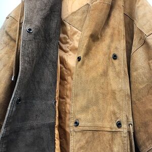 Stay stylish and comfortable with this tan leather jacket. Perfect for versatile wear. Has some flaws, as shown in photos. String missing end, sleeve cuffs well loved, some minor soiling, yet overall in pretty decent shape for ranching!
