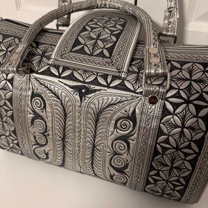 Looking for a beautiful day-to-day bag, gym bag or small carry-on bag? The mini-weekender bag will cover all your needs and turn heads, too! This handcrafted bag is truly unique and features traditional designs embroidered by our artisans in Sumatra. 100% cruelty-free, it is the perfect bag for the conscious consumer.