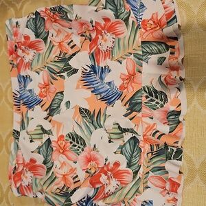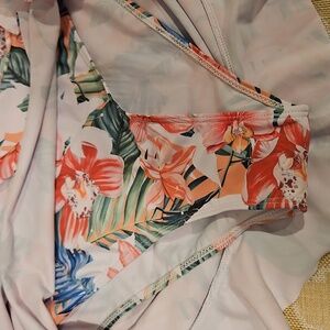 Stylish off-shoulder bikini set with a vibrant floral pattern. Features a ruffled top and matching bottoms. Super High 32" waist skirt with bottom and cinched sides. 17" pit to pit top with adjustable straps and removable pads.