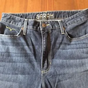 A high-rise waist with a slim bootcut, the Sarah is made out of our innovative tri-blend denim for maximum wearability and rebound. The Sarah features slimming dark wash denim with hand-sanded accents with our iconic Longhorn logo in sunny yellow on the back pockets and above the front right pocket. This style has quickly become a favorite for those looking for western riding jeans! The high-rise keeps shirts tucked in and the slim bootcut opening makes zipping up chaps a breeze.