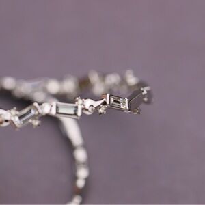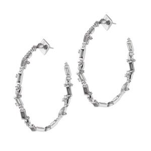 Baguette Swarovski crystals cover classic silvertone hoop earrings.