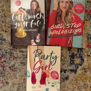 Set of three Rachel Hollis books including 'Girl, Wash Your Face', 'Girl, Stop Apologizing', and 'Party Girl'. Perfect for personal growth and inspiration.