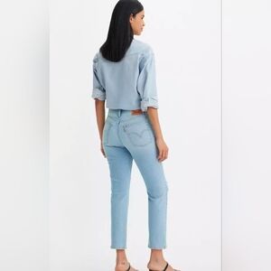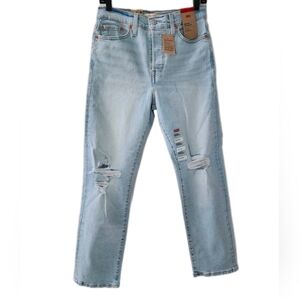 The Levi's Wedgie Straight Ankle Women's Jeans in a light wash with distressed accents are a stylish and versatile addition to any wardrobe.