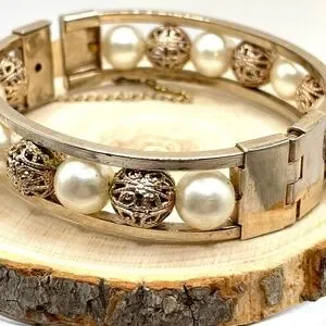 Vintage unsigned gold tone hinged bangle bracelet with filigree and faux pearl beads. Push-in clasp and safety chain. Measures about 5/8" wide. Pre-owned with very minor scratches at the hinge and clasp. Please ask if you have questions. Measures 2 1/2" across.