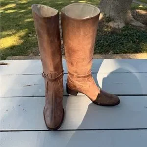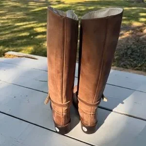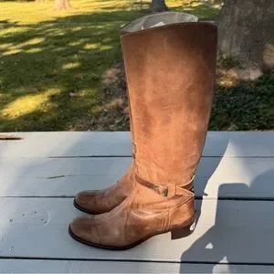Gently used and in very good condition. Made in Spain, these Charles David boots feature genuine tan leather with a sleek, structured design and a subtle buckle detail at the ankle. Comfortable stacked heel and high-quality craftsmanship for timeless, versatile style — perfect with jeans, skirts, or dresses.