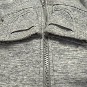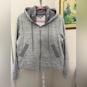 In good pre-love condition. Only signs of wear are on the sleeves by the wrist,very little wear. See all pictures. Jacket is light gray and stretchy. Pit to pit 21 inches flat. Shoulder to hem 23 inches.