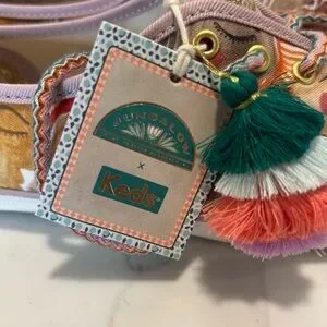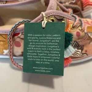 The Justina Blakeney Keds X Jungalow Champions Pink Chorus Sneakers in size 6.5 Women’s are a stylish and colorful pair of athletic shoes perfect for casual wear. Featuring a low-top design, lace-up closure, and canvas lining, these sneakers offer comfort and flexibility. The multicolor canvas upper with the Jungalow model design adds a trendy touch to any outfit, making them a versatile choice for all seasons. Made with a durable rubber outsole, these sneakers are a fashionable yet practical option for any woman on the go. Two shoe lace styles included.