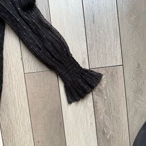 This elegant black blouse from STATE showcases puff sleeves and a ruffled mandarin collar, offering a sophisticated touch to your wardrobe. The lightweight fabric and pleated details enhance its flowing silhouette, making it a perfect choice for a chic and stylish look.