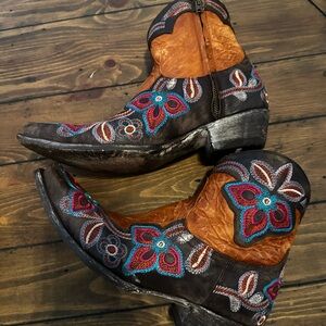 Stylish Old Gringo ankle boots. Brown leather with colorful embroidery. Unique and eye-catching design.