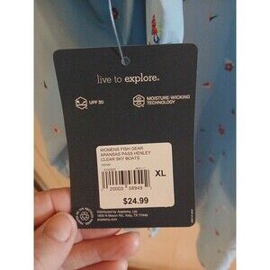 The Women's XL Magellan Fish Gear Aransas Pass Henley Clear Sky Boats Classic Fit shirt in blue is perfect for outdoor activities such as fishing, hiking, and beach outings. Made of 100% polyester, this shirt features a collared neckline, long sleeves, and a button closure. It is designed with UV protection, moisture-wicking, and breathable material to keep you comfortable during outdoor adventures. The shirt also has a stylish leaf pattern and is lightweight, making it ideal for active wear in casual occasions.