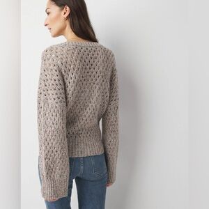 The open stitch design of this pullover is just one thing that makes it special. We’ve added sequins woven throughout for a subtle shimmer and designed the sleeves in a wider bell shape for added flair. This sweater also has ribbed details at the neckline, cuffs and hem.